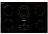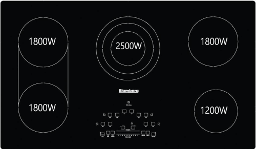 Blomberg 36” wide, full touch control + slide touch for intensity, 5 zone cooking surfaces including a bridge-zone, triple intensity zone, timer for cook top operation, and frame less design. Black Glass