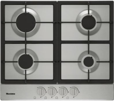 Blomberg 24” wide gas cooktop, four sealed gas burners, gas safety device, 15,000 BTU power burner with simmering, cast iron pan supports, integrated ignition, front knob control. Stainless