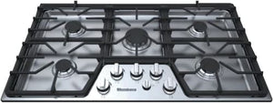 Blomberg 36” wide gas cooktop, five burners, front knob control with illumination, integrated ignition, auto reignition, cast iron pan supports, power burner with simmering. Stainless