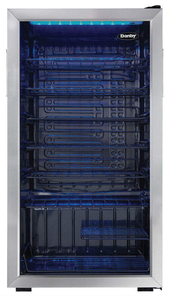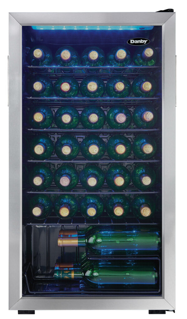 Danby branded free standing, 3.3 cu ft wine cooler. Stores up to 36 bottles wine, temp range 6C – 14C with blue LED interior light. Includes 6 black wire shelves and 1 staggered shelf. Reversible door, stainless steel door frame with side pocket handle, ISTA-6 carton.