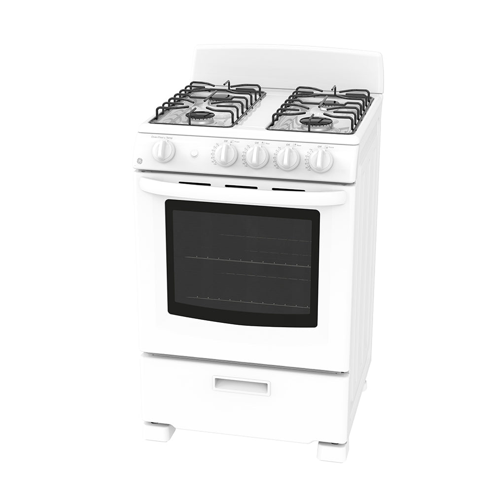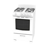 24” Free Standing Gas Range, 2.9 cu. ft., 36,000 BTU Cooktop Power, 4 Sealed Burners, Standard Clean, Bake Burner 13,000 BTU, Pull Down Broil Drawer, Removable Backsplash, White.